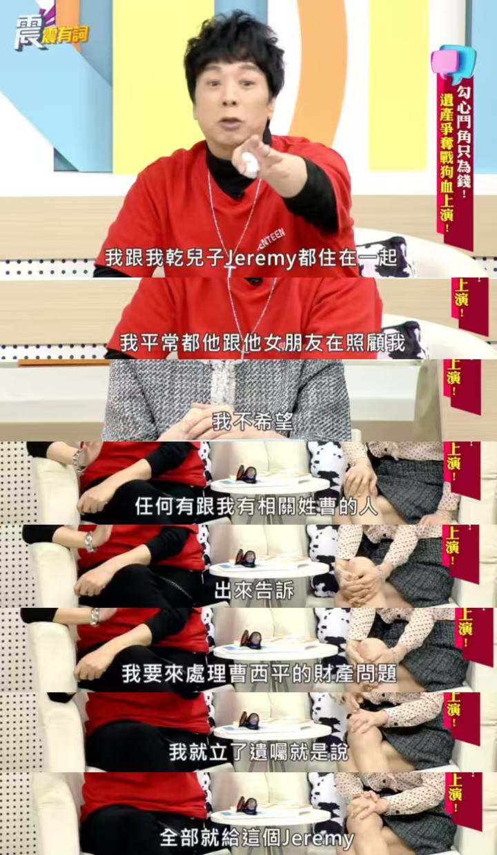 因为曹西平未婚无子,所以他曾在某档节目中公开表示:“我跟我干儿子Jeremy住在一起,平常都他跟他女朋友在照顾我。”他称不希望任何曹姓家人处理他的财产问题,“我就立了遗嘱就是说,全部就给这个Jeremy。”