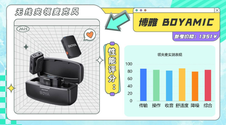博雅旗下的旗舰级高性价比无线领夹麦,主打专业音质、强降噪和长续航,适合追求专业收音效果、不想花费过高预算的创作者,适配户外嘈杂环境拍摄。